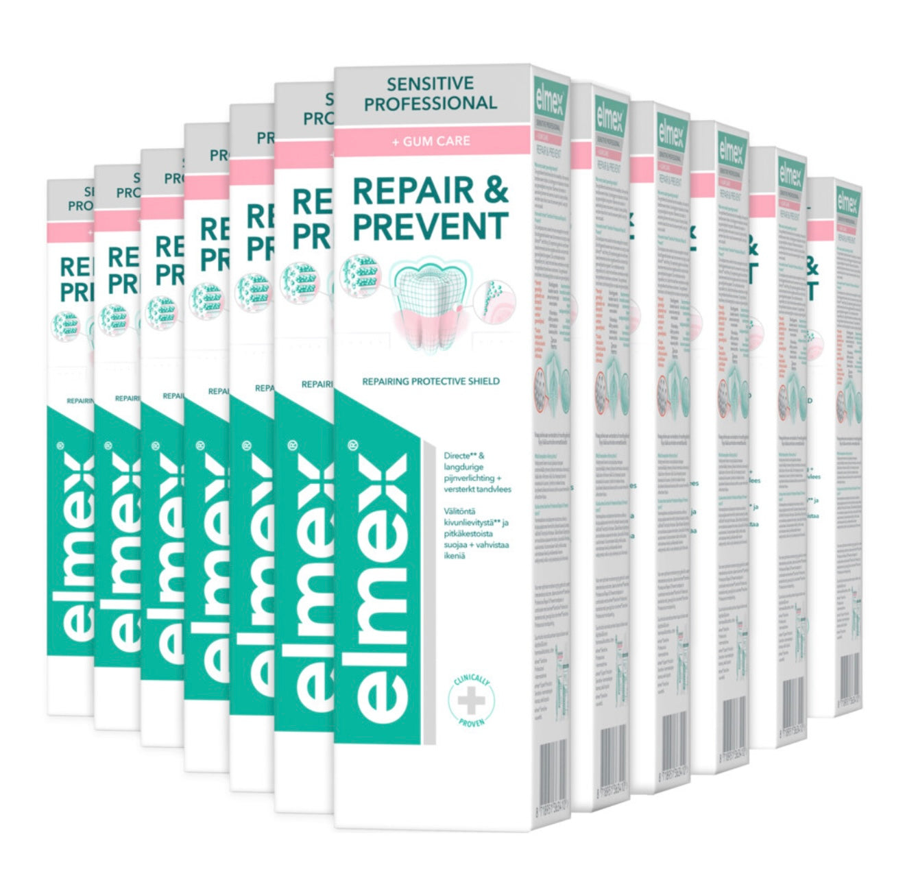 Elmex Sensitive Professional Repair & Prevent tandpasta biedt directe* en langdurige verlichting bij gevoelige tanden. De klinisch bewezen PRO-ARGIN® technologie, aanbevolen door tandartsen, helpt pijn te verminderen door de blootliggende dentinekanaaltjes te sluiten. De formule bevat bovendien zink, dat helpt terugtrekkend tandvlees – een belangrijke oorzaak van tandgevoeligheid – te voorkomen. Deze tandpasta is geschikt voor dagelijks gebruik en ondersteunt een gezonde mondverzorgingsroutine voor gevoelige tanden.