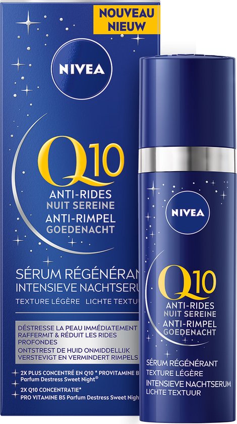Le Sérum de Nuit Anti-Rides NIVEA Q10 30 ml revitalise votre peau pendant la nuit. Aidez votre peau à se détendre et à profiter pleinement d'une bonne nuit de sommeil grâce à ce soin visage spécialisé, conçu pour les peaux sensibles. Ce sérum anti-rides favorise la réparation et la régénération de votre peau pendant votre sommeil. Sa texture légère est à peine perceptible, vous assurant un sommeil réparateur.