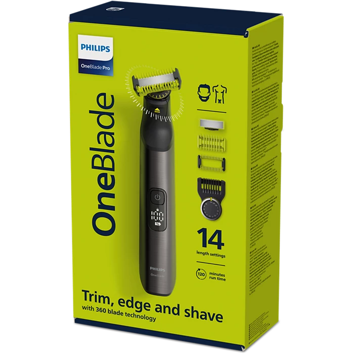 Avec la Philips OneBlade Pro 360 Visage + Corps – Argent – Tondeuse, rasoir et styler tout-en-un – Pochette de rangement incluse – QP6552/30, taillez, rasez et coiffez sans effort les poils du visage et du corps, quelle que soit leur longueur. La lame 360 innovante se déplace dans toutes les directions, vous permettant d'atteindre facilement les zones les plus difficiles en moins de passages*. Taillez votre barbe à la longueur souhaitée grâce au sabot de précision avec 20 réglages de longueur , utilisez le sabot corps (3 mm) pour une coupe confortable sur le corps ou fixez le capuchon de protection pour une protection supplémentaire des zones sensibles. Créez votre propre style rapidement et facilement avec la Philips OneBlade Pro 360. Chaque lame dure jusqu'à 4 mois**.