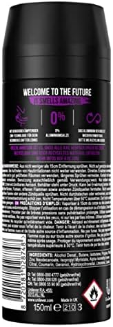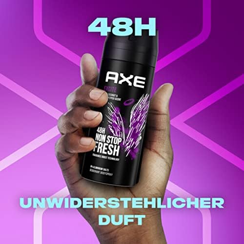 We leven waarschijnlijk in de meest spannende aller tijden. Alles lijkt vandaag mogelijk te zijn. Terwijl we vandaag dingen beleven en doen waar mensen nog onlangs nog niet van durven dromen, wacht het volgende avontuur al in de volgende seconde, in de volgende straat of achter de volgende glimlach. Voor deze spannende tijden is deze deospray met zijn spannende geur gecreëerd. Het combineert de efficiënte AXE-bescherming tegen lichaamsgeur met een van de meest fascinerende geuren, ontwikkeld door de beste geurexperts ter wereld. Met de nieuwe Dual Action Technology bestrijdt de bodyspray geurvormende bacteriën en bindt onaangename geuren. De innovatieve zinktechnologie zorgt voor een bijzondere geurervaring. Volledig zonder aluminiumzouten beschermt de deodorant zijn drager zo effectief dat hij zelfs in de meest spannende situaties op zijn soeverein veilige uitstraling kan vertrouwen. De geur is opgebouwd als een fascinerend verhaal met meerdere karakters. De hoofdrolspeler is een houtachtige basisgeur met een mannelijk-krachtige aanwezigheid. Maar de echte sterren van de geschiedenis heten kokosnoot, hazelnoot en karamel. De buitengewone karakters zijn perfect op elkaar afgestemd en geven het verhaal met hun schattige, subtiele touch een verrassende wending. Samen resulteert dit in een spannende compositie, die de zintuigen stimuleert en tegelijkertijd veilig en zonder aluminium tegen onaangename geuren beschermt. Gewoon een korte spray op de oksels en het bovenlichaam doen en dankzij de Fragrance Boost Technology een tot 48 uur aanhoudende frisheid beleven. AXE zet zich in voor duurzaamheid: onze ambitie is dat alle AXE-verpakkingen tot 2025 recyclebaar zijn of zelfs al gerecycled materiaal bevatten. Het aluminium van de deodorantbus is onbeperkt recyclebaar. De lege doos in recycling doen.