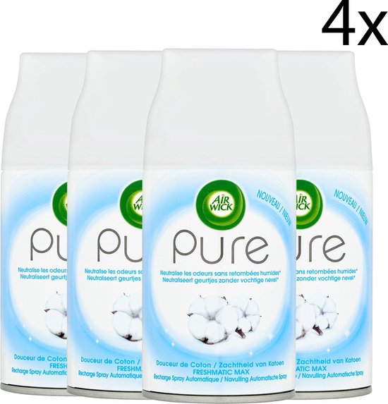 Air Wick Freshmatic Automatische Spray Luchtverfrisser neutraliseert geurtjes en laat je woning fris ruiken. Air Wick Freshmatic is een luchtverfrisser die een heerlijk frisse geur in huis brengt en verspreidt dit tot wel 60 dagen (op de laagste stand). Hang de luchtverfrisser aan de muur of plaats hem op een wandrek of kast en kies zelf uit drie intensiteitsniveaus. Geschikt voor alle vertrekken van het huis. De Zachtheid van Katoen Freshmatic neutraliseert geuren en verspreidt een frisse katoengeur in uw huis, zonder toegevoegd water en met 24/7 odour stop technology. Dit is een grootverpakking en bevat 4x 250ml.