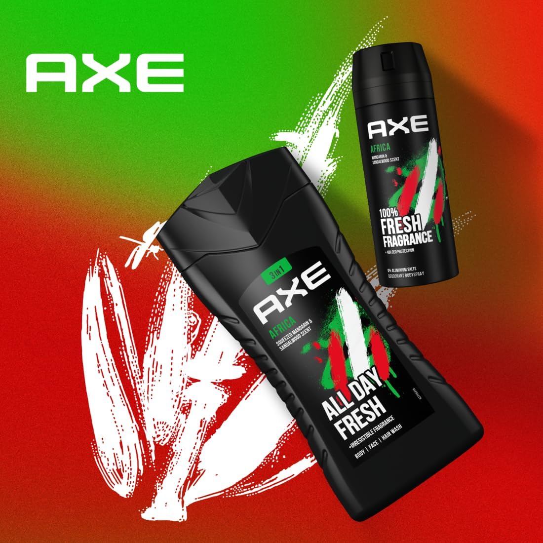 Voor een wereld vol nieuwe verbindingen werd AXE Africa met zijn spannende mannelijke geur gecreëerd. Het is nu al meer dan tien jaar een van de populairste bodysprays en combineert de effectieve AXE-bescherming tegen lichaamsgeur met een prachtige, exotische geur, ontwikkeld door de beste geurexperts ter wereld. Volledig zonder aluminium beschermt AXE Africa zijn drager zo effectief dat hij altijd op zijn aantrekkelijke uitstraling kan vertrouwen.