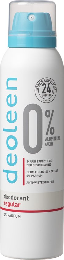 Deoleen deodorant 0% aluminium Regular spray bevat géén aluminium (ACH), parfum en laat geen witte strepen achter op je kleding Deoleen 0% biedt 24 uur effectieve deo bescherming op milde wijze en zorgt voor een schoon en fris gevoel.