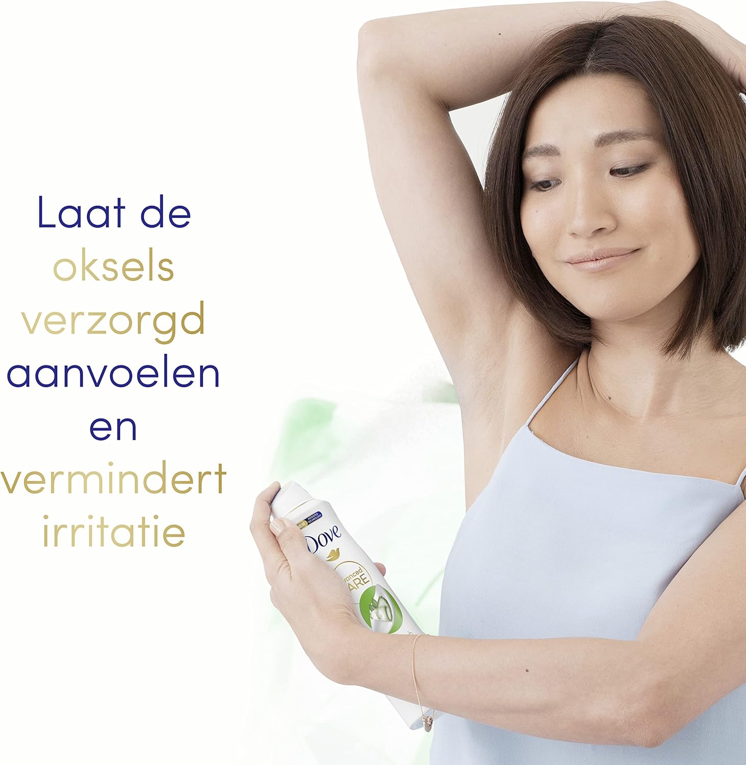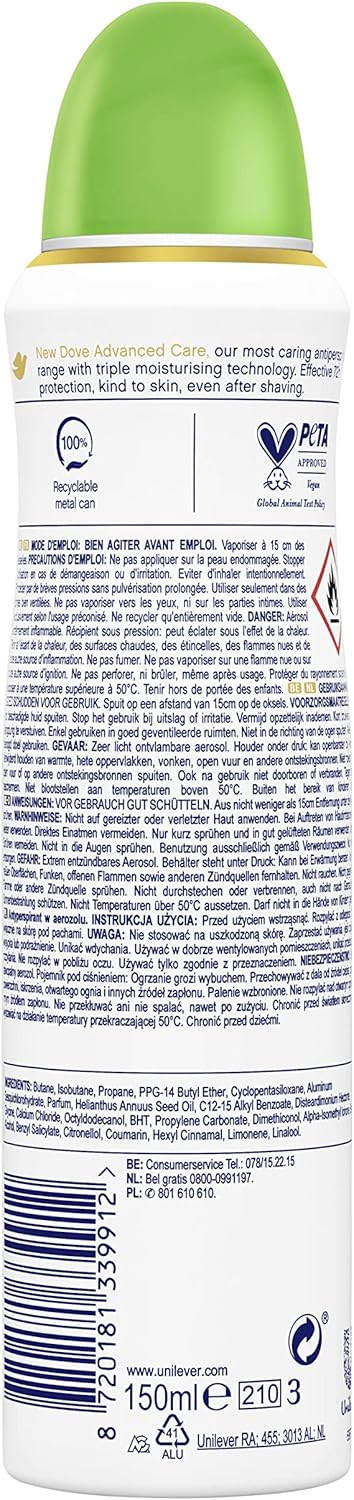 Waarom Dove Advanced Care Anti-Transpirant? Dove Advanced Care Go Fresh Cucumber & Green Tea Anti-Transpirant Deodorant Spray is geïnspireerd op de natuur. De komkommer zorgt voor verfrissing, terwijl je van de geur van groene thee een rustig en ontspannen gevoel krijgt. Daarnaast geeft de deodorant de vertrouwde bescherming die je gewend bent van Dove. Dat betekent 72 uur lang bescherming tegen zweet. De Dove Advanced Care anti-transpiranten maken deel uit van de meest verzorgende lijn van Dove, met de verbeterde gepatenteerde formule zijn ze zacht voor de huid. Het Advanced Care assortiment van Dove biedt met de Triple Moisturising technologie tot 72 uur bescherming tegen zweet. De hele dag een fris en verzorgd gevoel – wat de dag je ook brengt! Deze deodorant spray met verzorgende eigenschappen van komkommer helpt om je gevoelige huid te herstellen van irritatie veroorzaakt door het scheren. Hoe te gebruiken? Schud de spuitbus, houd de bus op ongeveer 15 cm van je oksel en spray kort en stevig. Dove biedt naast anti-transpiranten ook deodoranten aan. Beide geven een langdurig fris gevoel en hebben een verzorgende werking voor de kwetsbare okselhuid. Anti-transpiranten bevatten aluminiumzouten die de hoeveelheid zweet verminderen en ervoor zorgen dat je oksels droog blijven, zodat onaangename geurtjes geen kans krijgen. Deodoranten bevatten geen aluminiumzouten, maar wel actieve ingrediënten die ongewenste geurtjes bestrijden. Beide formules zijn vrij van alcohol en verrijkt met de Triple Moisturising technologie. Dus welke je ook kiest, je kunt altijd vertrouwen op bescherming, frisheid en heerlijk zachte, gladde en verzorgde oksels. Het verhaal van Dove Dove ondersteunt vrouwen wereldwijd bij het realiseren van hun volledige potentiële en individuele schoonheid door verzorgingsproducten te ontwikkelen die inspelen op de persoonlijke behoeften van hun huid en haar. Want wij geloven dat wie zich mooi en lekker in zijn vel voelt met de hulp van de juiste verzorging, dat ook kan uitstralen. Om de impact op het mileu te verminderen hebben de Dove anti-transpiranten en deodoranten een andere verpakking gekregen. De aluminium spuitbus van deze anti-transpirant is 100% en oneindig recyclebaar. De Dove anti-transpirant deodorants zijn vegan en dragen het PETA-approved keurmerk.