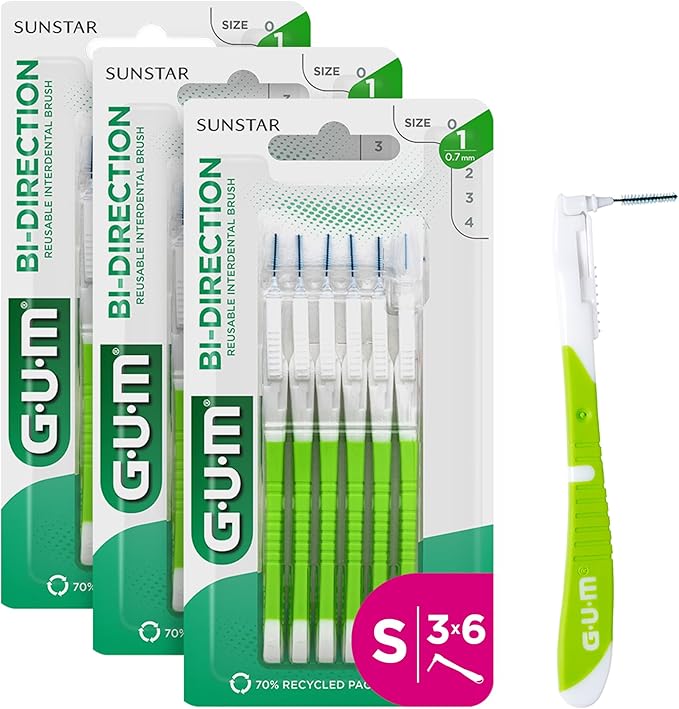 GUM BI-DIRECTION interdentale borsteltjes met ISO maat 1 (0,7 mm), ontworpen met een langere handgreep voor een eenvoudige en grondige reiniging van de ruimtes tussen de tanden. Verpakking bevat 3 sets van elk 6 borsteltjes (totaal 18 stuks).