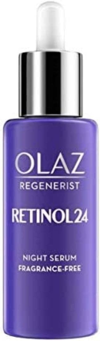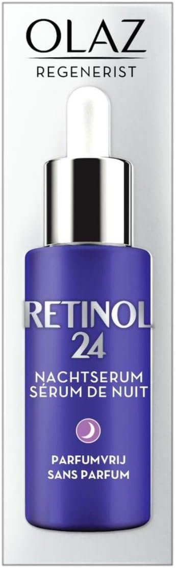 Het nachtserum, Olay Regenerist Retinol24 dringt diep door in de oppervlakkige huidlagen. De gepatenteerde blend combineert vitamine B3 met Olay's retinoïde complex. Het hydrateert je huid 24 uur lang en heeft veel voordelen. U zult verbeteringen zien in fijne lijntjes en rimpels, gladheid, helderheid, versteviging, donkere vlekken en poriën. Dit parfumvrije, kleurstofvrije serum trekt snel in en dringt diep door in de oppervlaktelagen van je huid, zodat je elke ochtend wakker wordt met een stralende, jonger uitziende huid. Gebruik Olay 28 dagen lang elke dag en je huid ziet er echt anders uit. Retinol 24 is geschikt voor dagelijks gebruik. Dit product bevat: Olay Regenerist - Retinol24 Parfumvrij Nachtserum - 40 ml