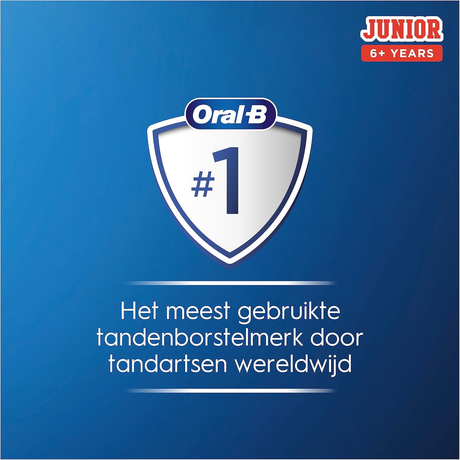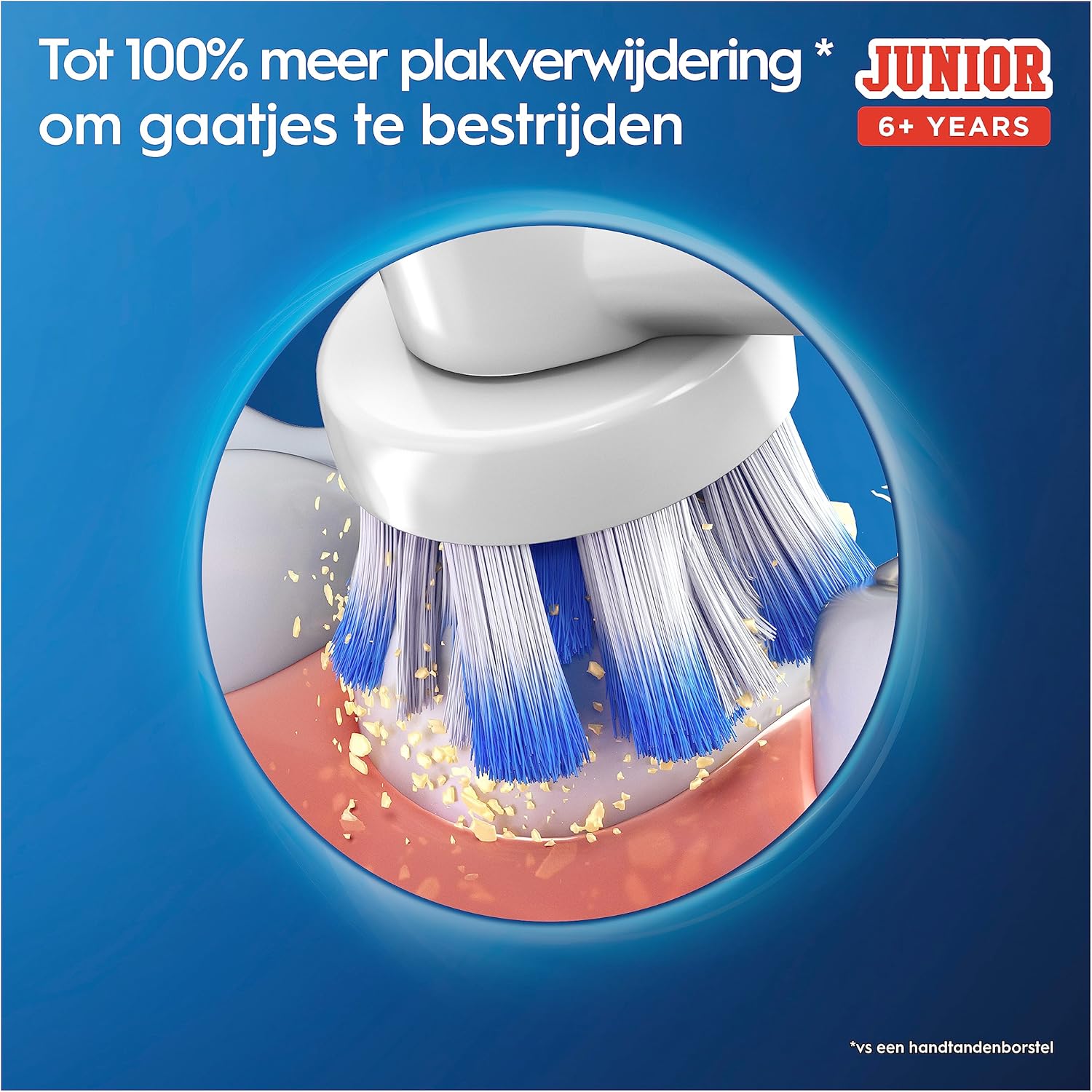 Kinderen hun tanden laten poetsen kan een hele opgave zijn. De Oral-B Junior 6+ oplaadbare elektrische tandenborstels zijn verkrijgbaar in verschillende leuke kleuren en ideaal om uw kind aan te moedigen om correct te poetsen en goede mondverzorgingsgewoonten aan te leren voor de rest van hun leven. Deze oplaadbare elektrische tandenborstel voor kinderen heeft extra zachte borstelharen die zacht zijn voor de tanden en het tandvlees van kinderen en meer tandplak verwijderen dan een manuele tandenborstel. De ingebouwde timer leert kinderen om de door tandartsen aanbevolen 2 minuten te poetsen, en waarschuwt hen om elke 30 seconden van poetszone te wisselen. De Oral-B Junior 6+ electrische tandenborstel kan gebruikt worden in combinatie met de volgende vervangende opzetborstels: Cross Action, 3D White, Sensi Ultrathin, Sensitive Clean, Precision Clean, Floss Action, Tri Zone, Dual Clean, Power Tip en Ortho Care.