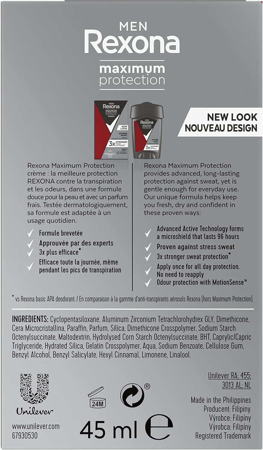 Ontdek de anti-transpirant-deodorantstick Rexona Maximum Protection Intense Sport. Een deodorant voor heren met een frisse geur, die intensief zweten reguleert en 96 uur lange werkzaamheid tegen geur biedt.